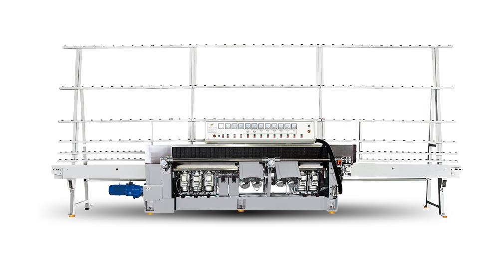 該機(jī)器主要用于平板玻璃底邊及大棱邊的磨削,其中磨頭分布及其合理,當(dāng)中有5個(gè)磨削底邊,4個(gè)磨削45°大棱邊,能精確地一次過(guò)磨出玻璃的平底邊及大棱邊,本機(jī)具有實(shí)用性強(qiáng),操作簡(jiǎn)便,使用成本低等優(yōu)點(diǎn)。